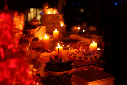 Ce buffet est entièrement éclairé à la bougie avec des chandeliers et des petits luminions qui éclairent chaque Gâteau, ce qui lui confère une ambiance particulière dans la nuit avec pour fond la cathédrale illuminée .
